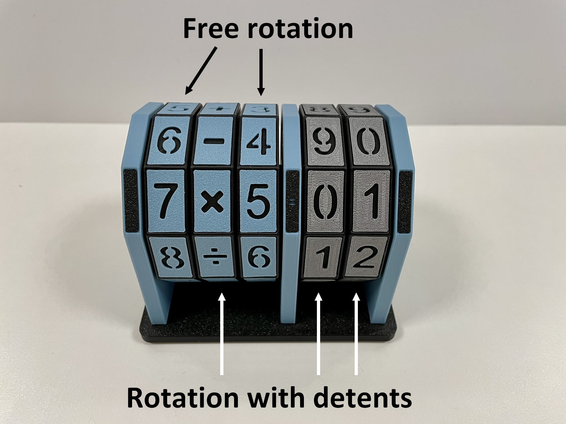 A maths trainer for the 4 basic arithmetic operations. Perfect for starting primary school. By turning it, new random tasks are created again and again. You can choose to rotate the wheel with the arithmetic operations freely (for advanced users) or with a detent (for beginners).